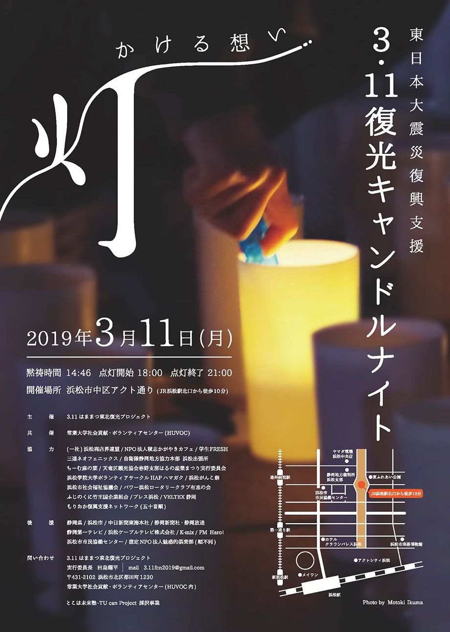 | 主催 | 3.11はままつ東北復光プロジェクト ThunderBirds(常葉大学浜松キャンパス)、Global English(聖隷クリストファー大学)、HAPハマガク(浜松学院大学)、ピアーズ(静岡産業大学磐田キャンパス)、Luce(浜松医科大学)、学生FRESH*、スポアートサポートとうかい*、話っ、輪っ、和っ!2018実行委員会* |