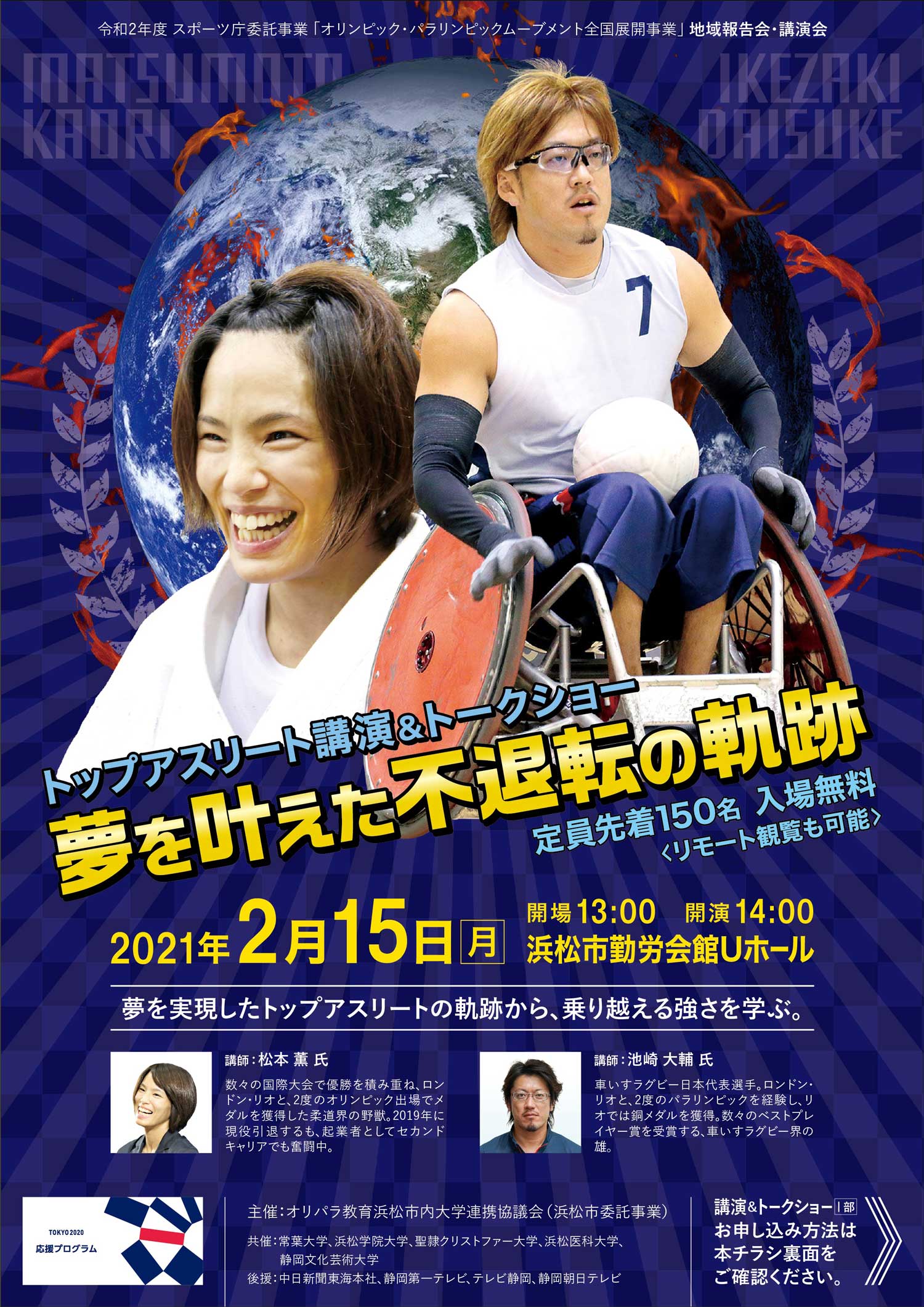 浜松市内の5大学が設置する「オリパラ教育浜松市内大学連携協議会」が、2020年度、浜松市内での教育実践活動の報告会に合わせ、トップアスリート講演会を開催いたします。