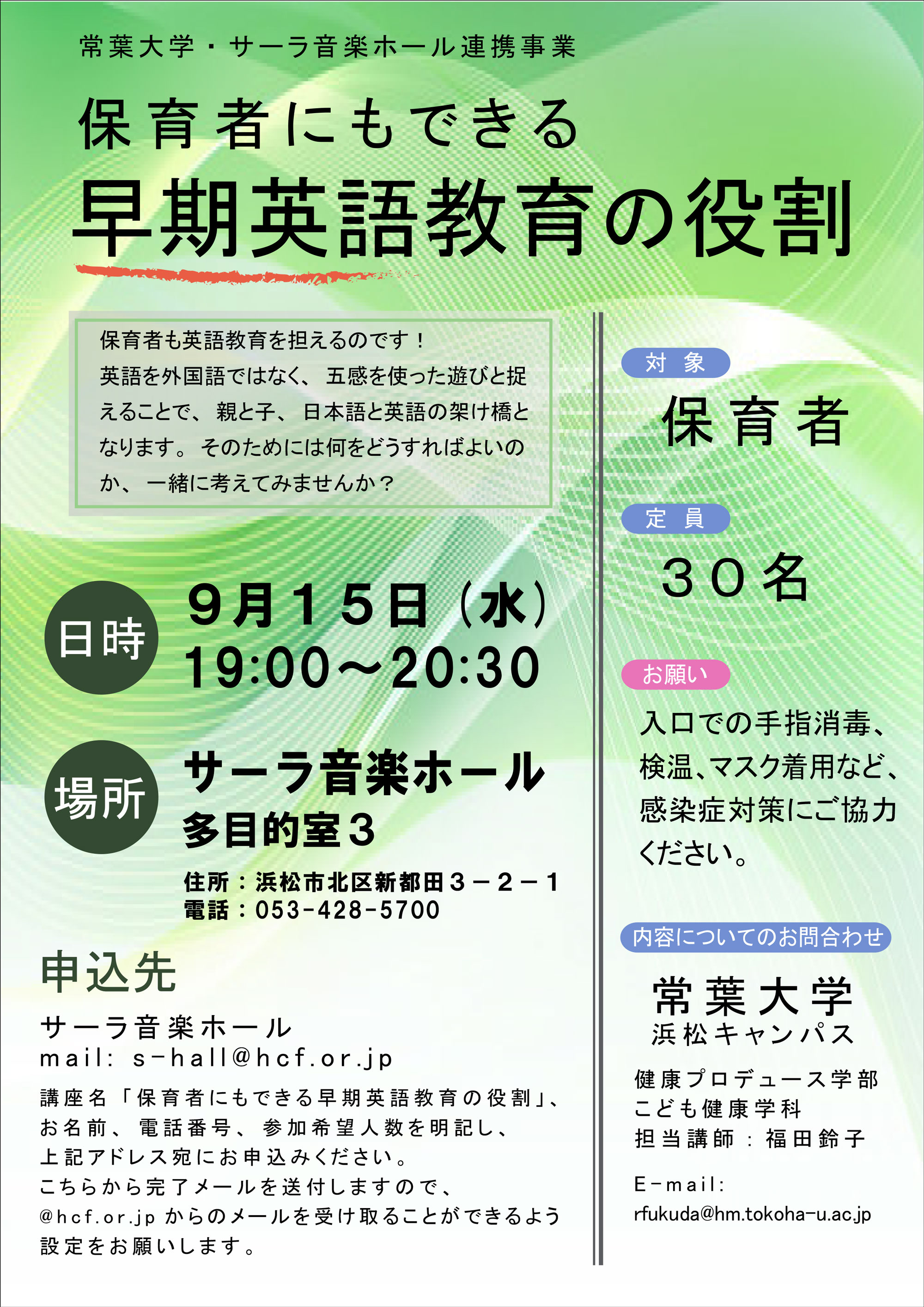 | 2021年9月15日(水曜日) | 大学生企画運営による市民講座「保育者にもできる早期英語教育の役割とは」 |
