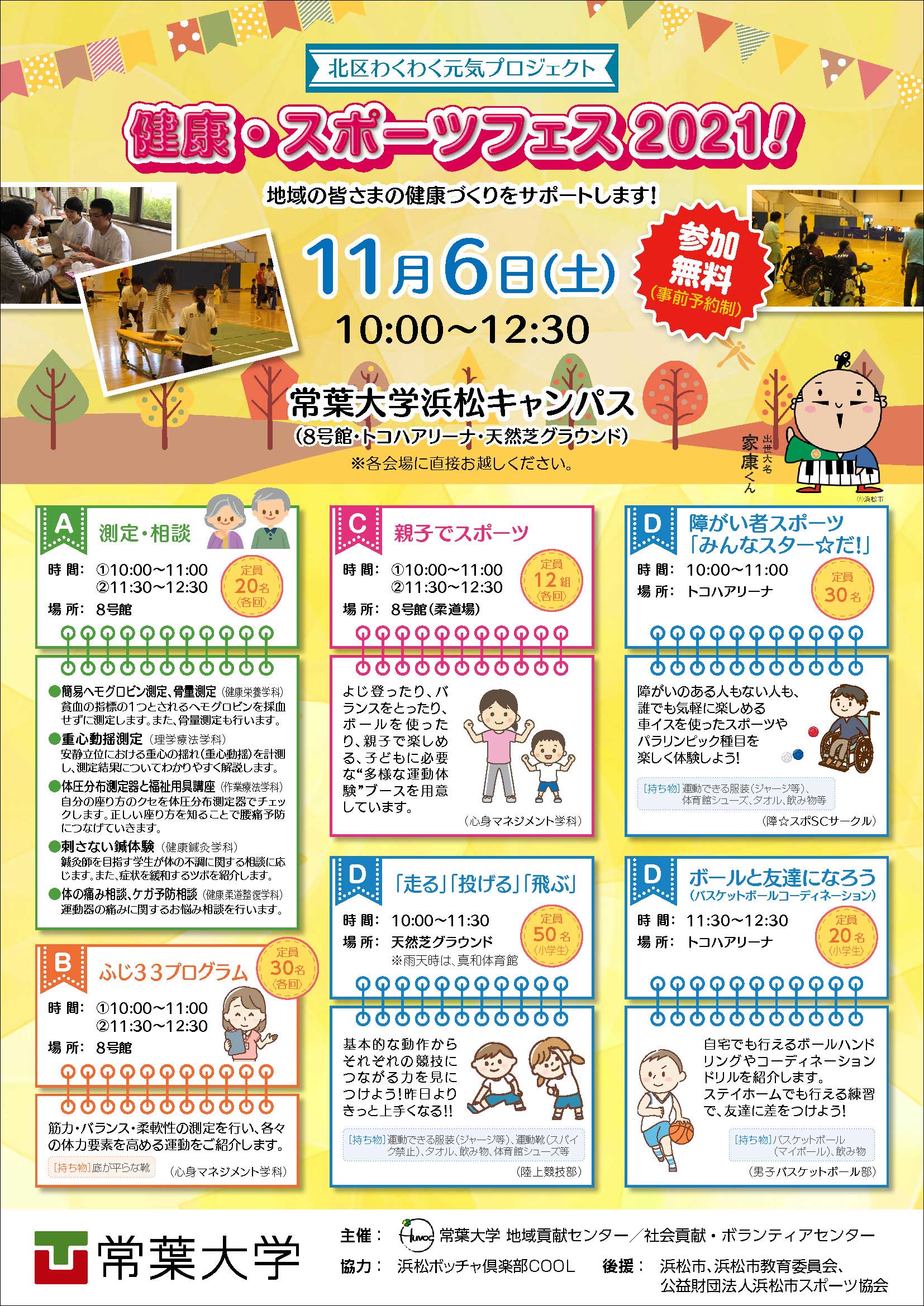 地域貢献センター/HUVOCは、北区わくわく元気プロジェクト「健康・スポーツフェス」を11月6日(土曜日)に、浜松キャンパスで実施します。
