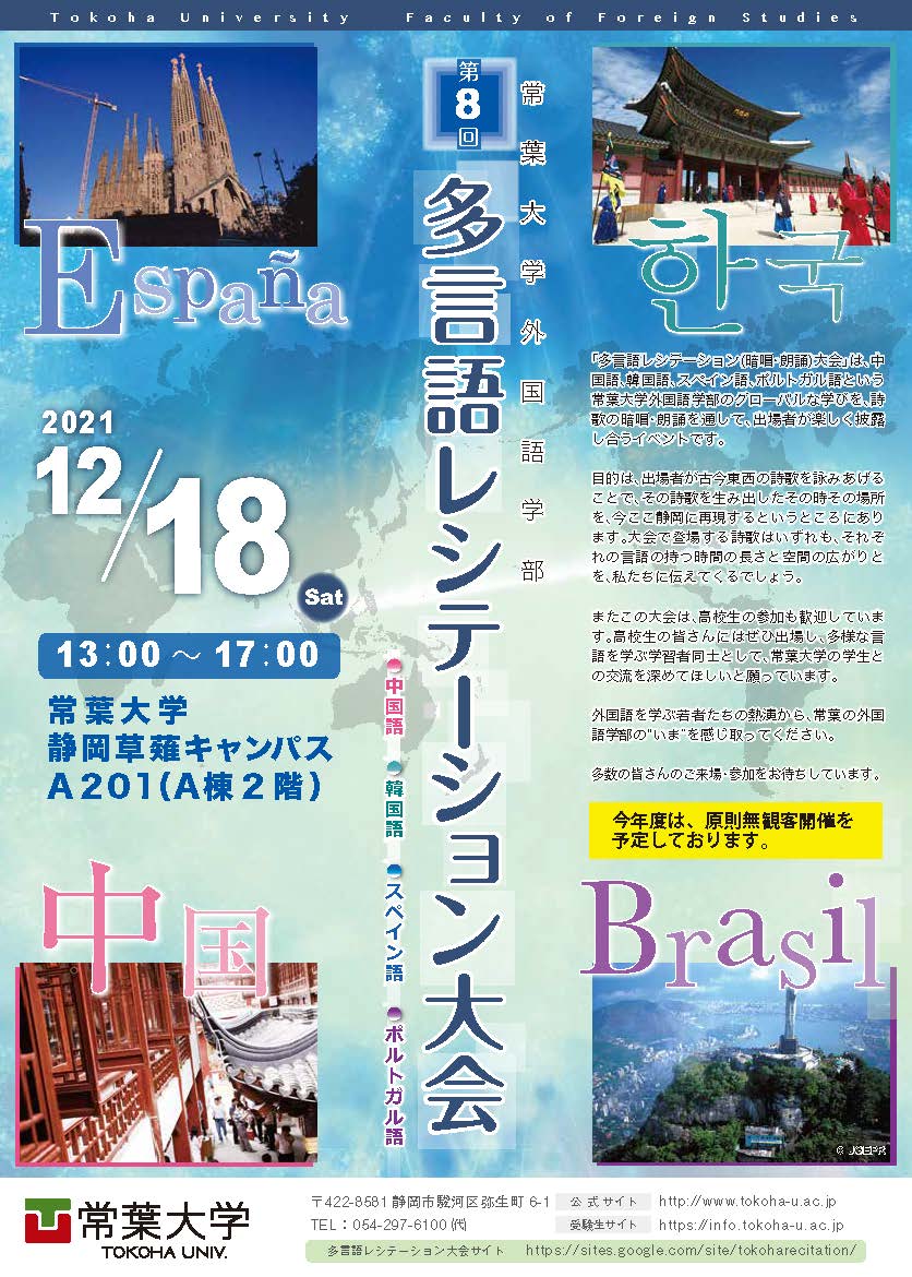 今年、第8回を迎える「多言語レシテーション大会」は、中国語、韓国語、スペイン語、ポルトガル語という常葉大学外国語学部のグローバルな学びを、詩歌の暗唱・朗誦を通して、出場者が楽しく披露し合うイベントです