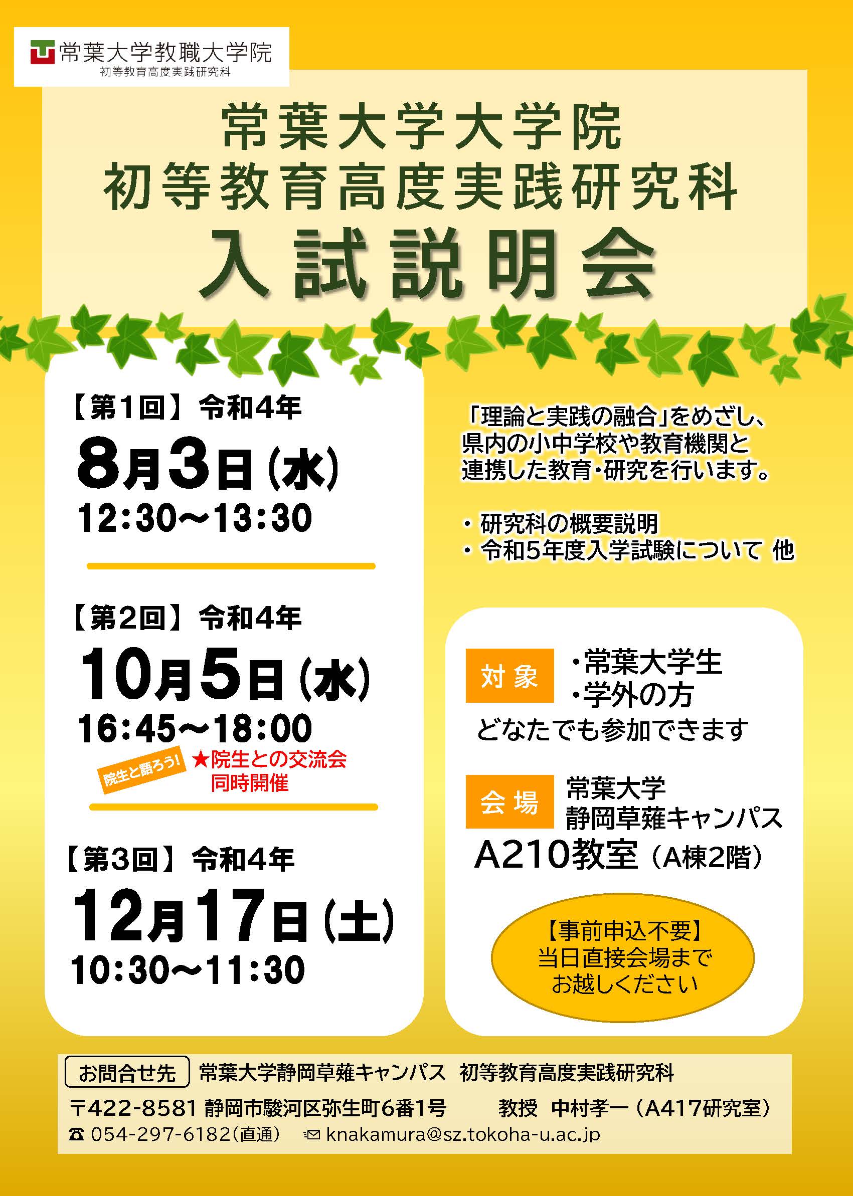 令和5年度 常葉大学大学院 初等教育高度実践研究科 入試説明会を 常葉大学静岡草薙キャンパスにて開催します。