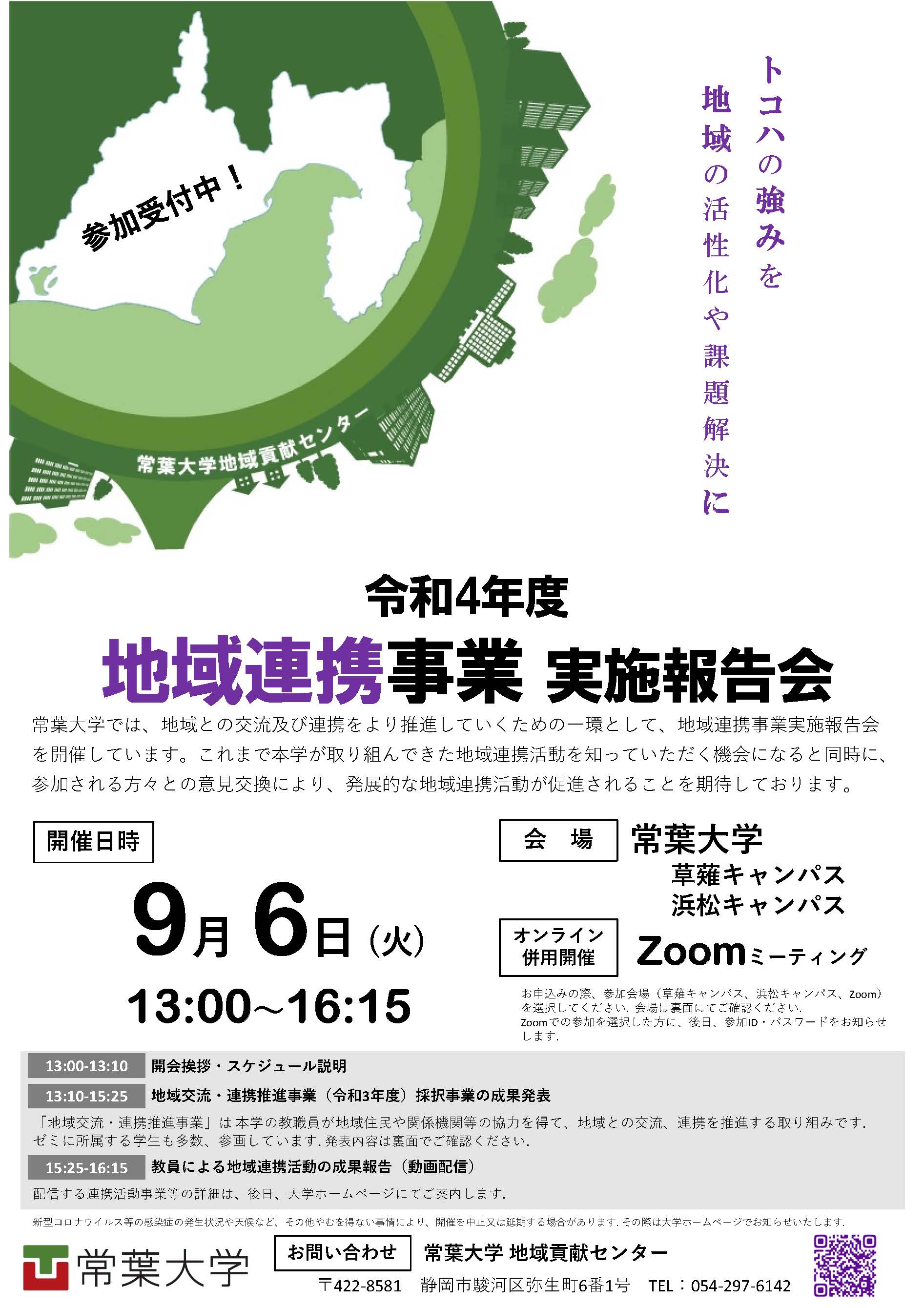 | 問い合わせ先 | 常葉大学地域貢献センター TEL:054-297-6142 E-mail:community(@を挿入)sz.tokoha-u.ac.jp |