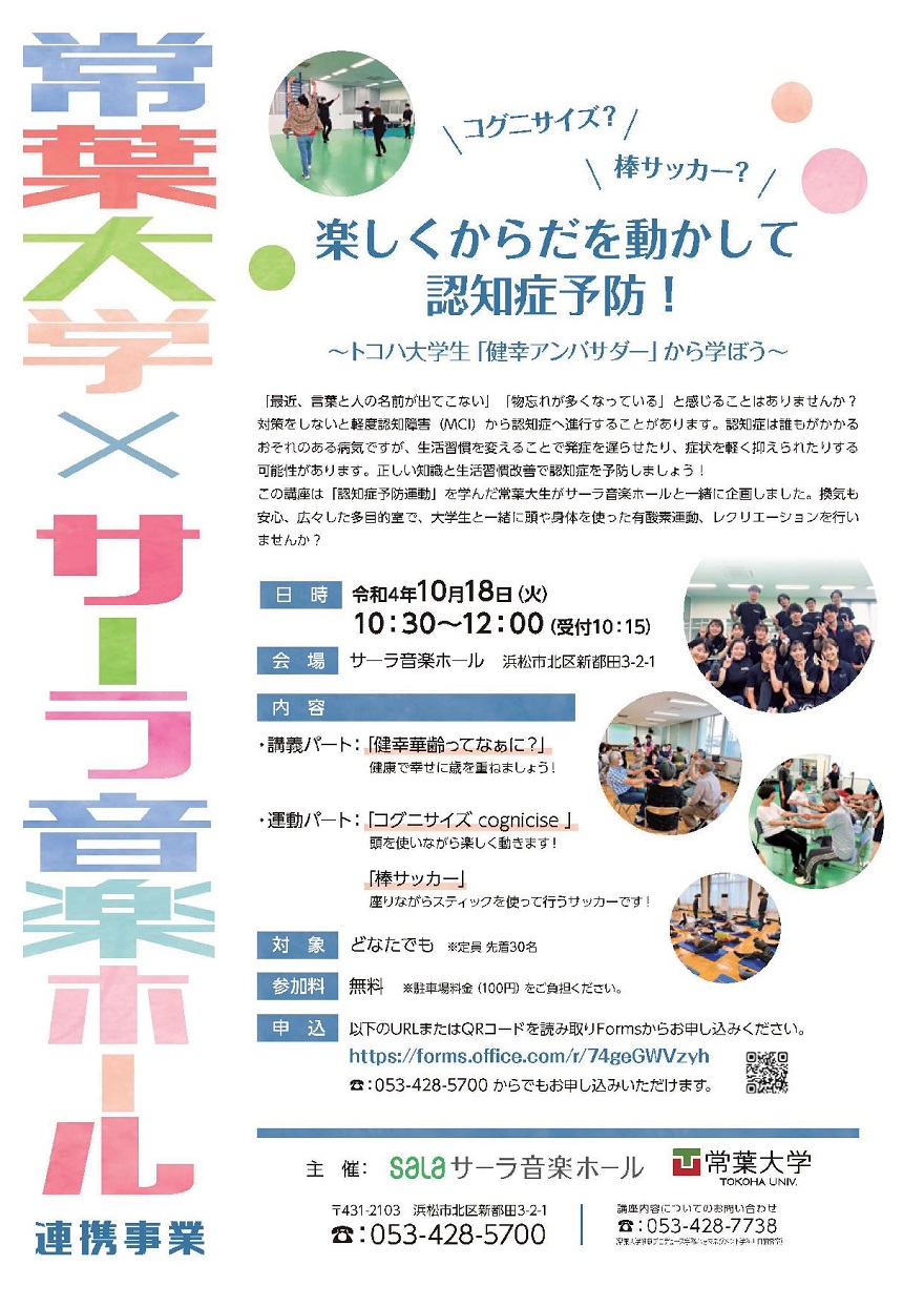 このたび、本学健康プロデュース学部心身マネジメント学科井口ゼミの学生が、サーラ音楽ホールと連携し、「認知症」をテーマに講座を開講します。