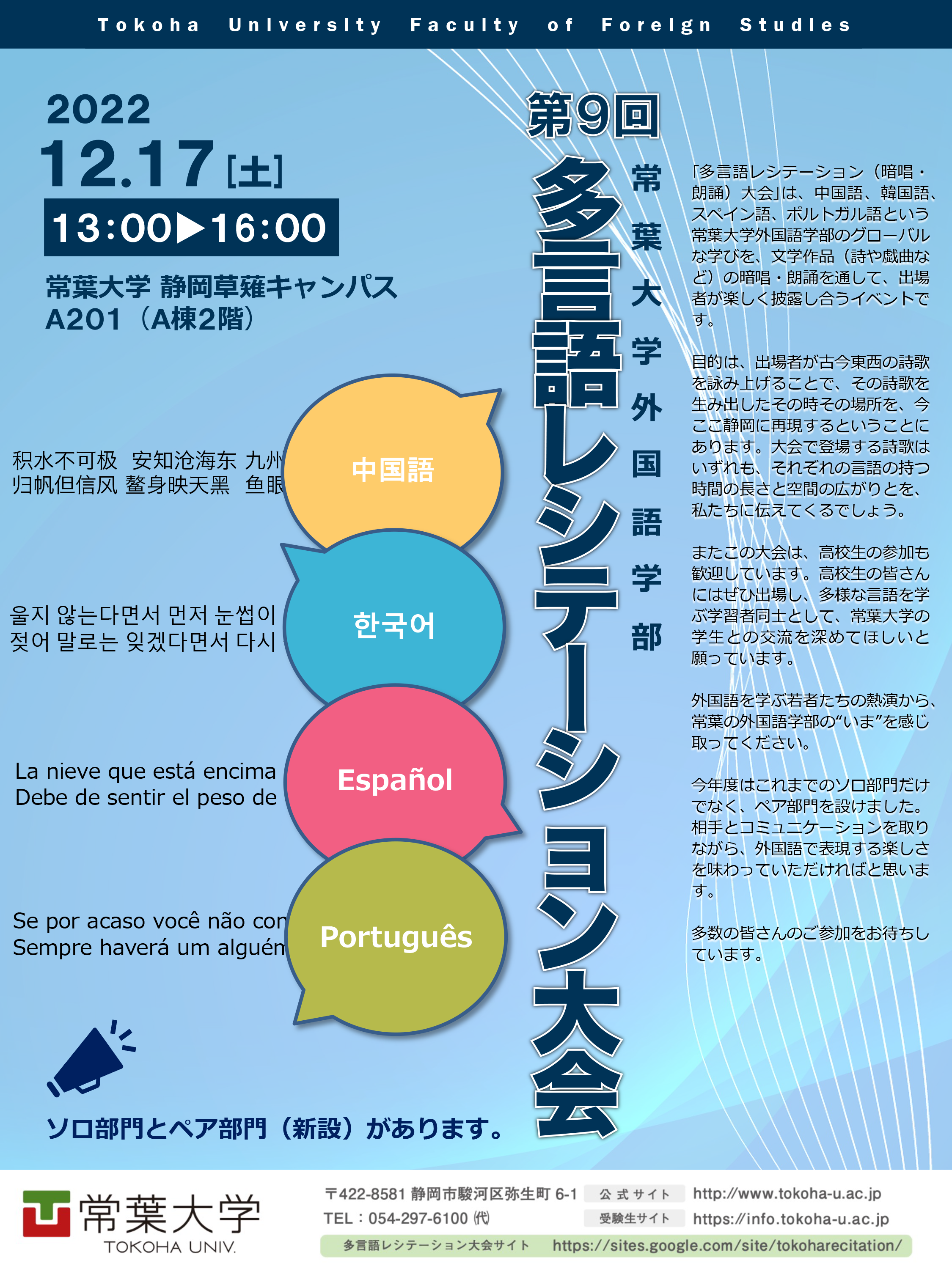 今年、第9回を迎える「多言語レシテーション大会」は、中国語、韓国語、スペイン語、ポルトガル語という常葉大学外国語学部のグローバルな学びを、文学作品(詩や戯曲など)の暗唱・朗誦を通して、出場者が楽しく披露し合うイベントです。