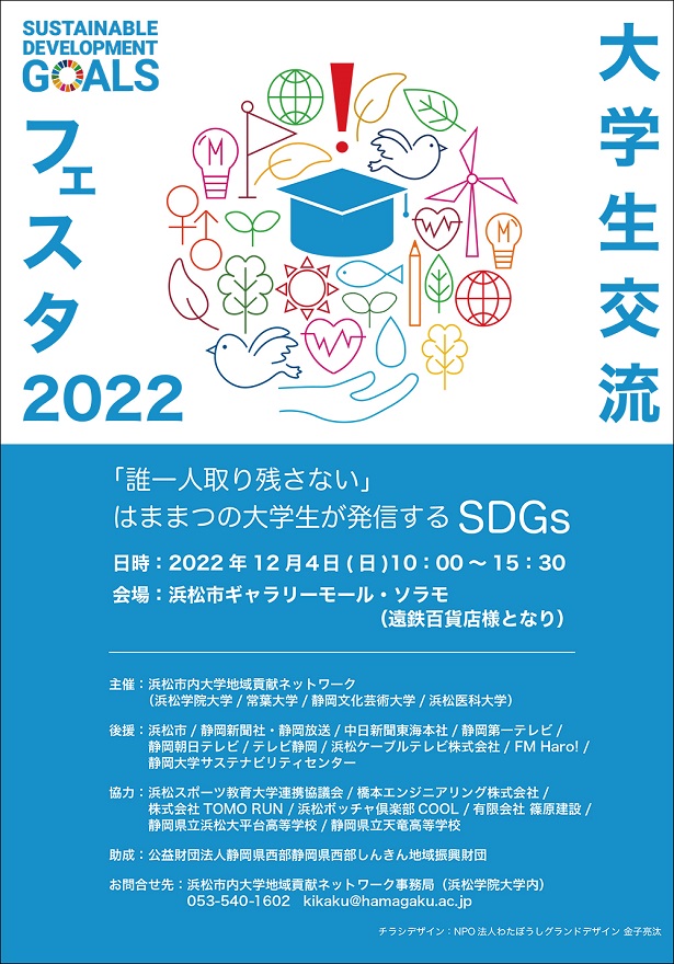 浜松市内の学生たちが、大学や学部の垣根を超えて集い、SDGsをテーマに活動成果の発表や、体験ブース、クイズ大会やゲームなど、さまざまな催しを行います。ぜひ足をお運びください。