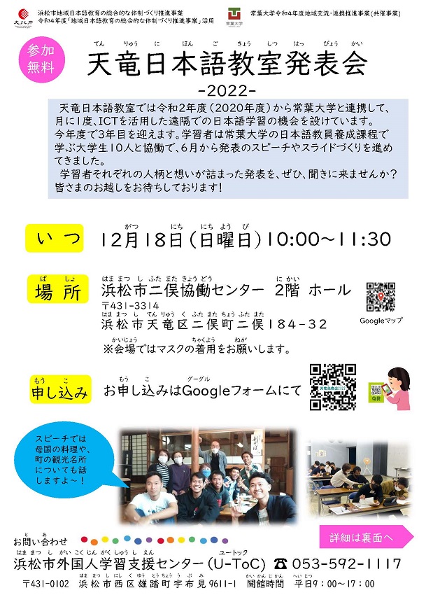 2022年12月18日(日曜日)に浜松市天竜区の二俣協働センターにて、天竜日本語教室発表会が行われます。