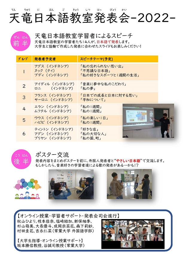天竜日本語教室では、浜松国際交流協会と常葉大学が連携して、月に1度常葉大学生によるICTを活用した遠隔での日本語学習を行っています。