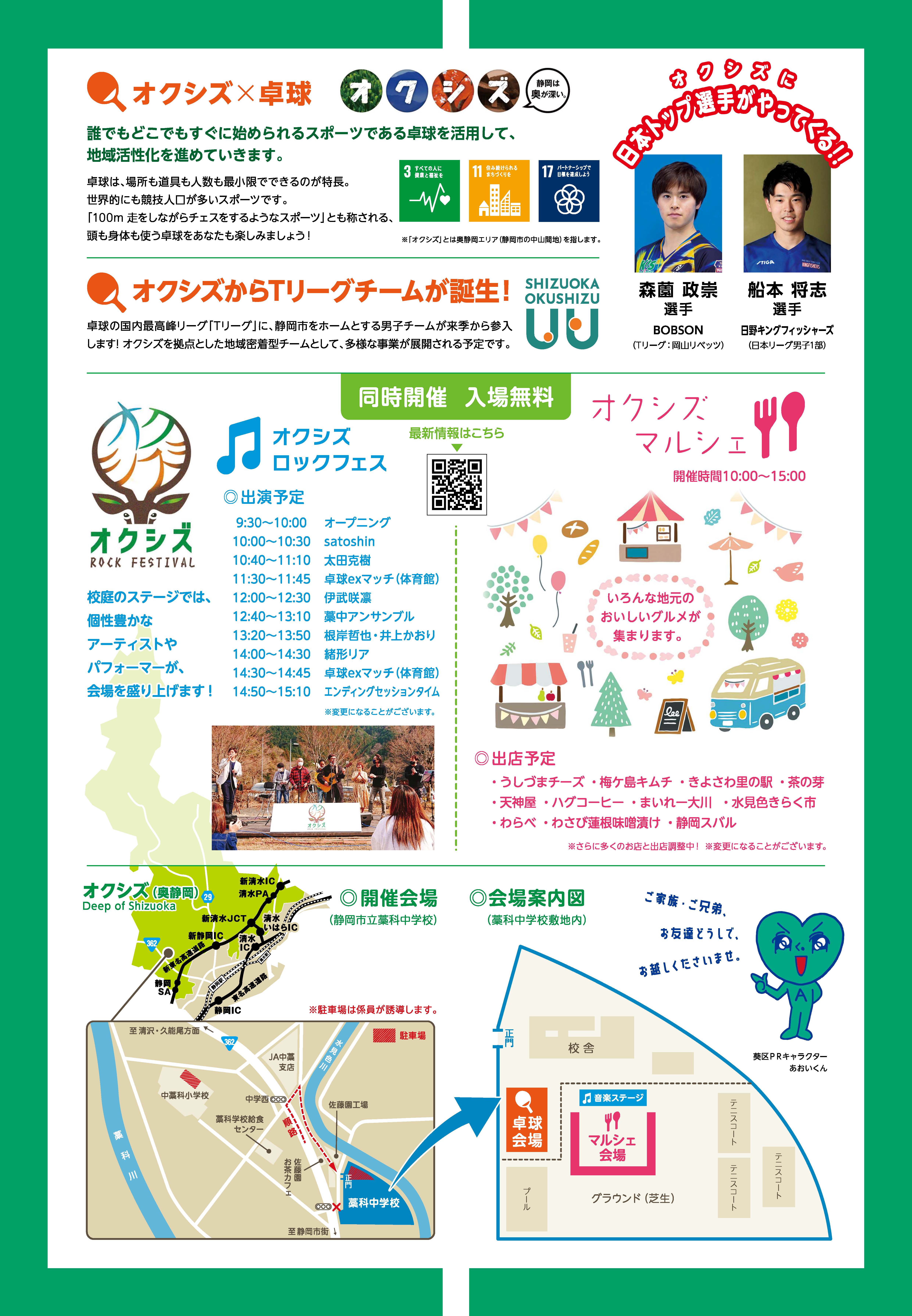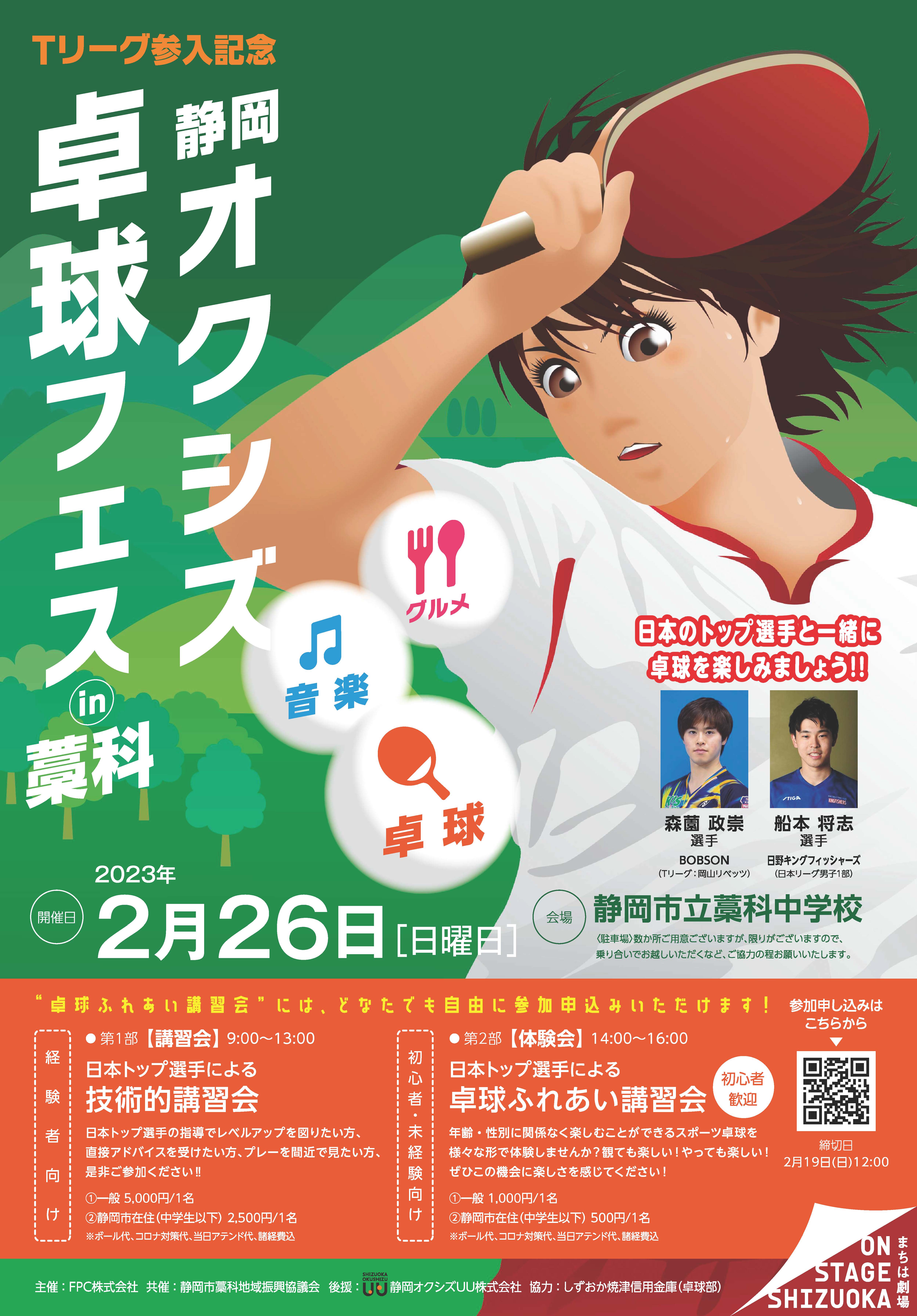 卓球Tリーグ男子チーム「静岡ジェード」が静岡市の中山間地域の「オクシズ」に誕生することに合わせて、2月26日(日曜日)に「静岡オクシズ卓球フェスin藁科」が開催されます。当日は日本トップクラスの選手による講習会をはじめ、音楽のイベント、地元名産品の飲食・物販なども開かれます。常葉大学経営学部の山田・酒井ゼミナールに所属する学生は、当日の会場運営のボランティアとして活動します。本活動は令和4年度しずおか中部連携中枢都市圏地域課題解決事業の一環として実施されるものです。