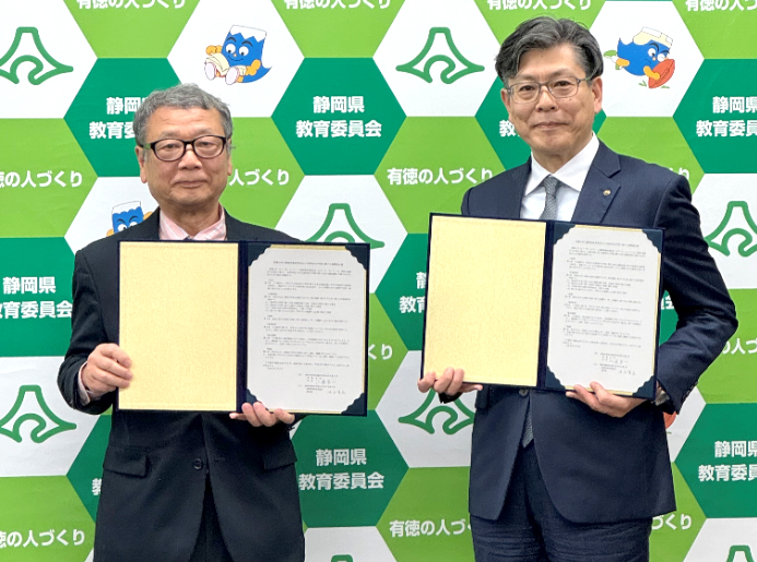 令和6年3月12日(火曜日)に静岡県教育委員会と探究的な学習に関する連携協定を締結しました。締結式には、静岡県教育委員会の池上重弘教育長と本学の江藤秀一学長が出席し、協定書を取り交わしました。この協定は、静岡県教育委員会と連携し、本学が有する教育研究の知見を各高等学校の総合的な探究の時間への支援を行うことで、本学の教育理念の一つである地域貢献を果たすことを目的としています。本学では、令和5年度から「総合的な探究の時間」への講師派遣事業を開始し、来年度は、高大連携活動の更なる発展を目指し、令和7年1月26日に静岡県教育委員会との共催による「高校生探究学習発表会(仮称)」の開催を予定しています。この「高校生探究学習発表会(仮称)」の企画・運営には、本学の学生スタッフも加わり、静岡県教育委員会と教職学による一体となった運営を行い、探究学習の質の向上と発展に努めて参ります。