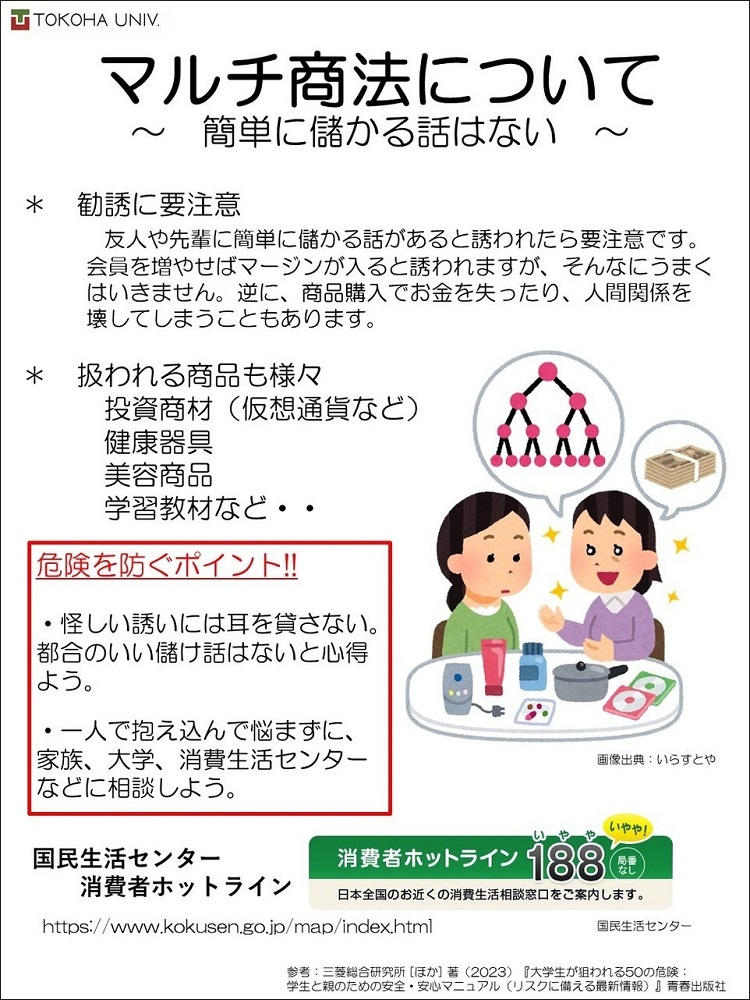 学生部では、学生がその様な事案に巻き込まれないようにマルチ商法についてのポスターを作成し、キャンパス内において掲示や学生のポータルサイトに掲載し注意喚起を呼び掛けています。