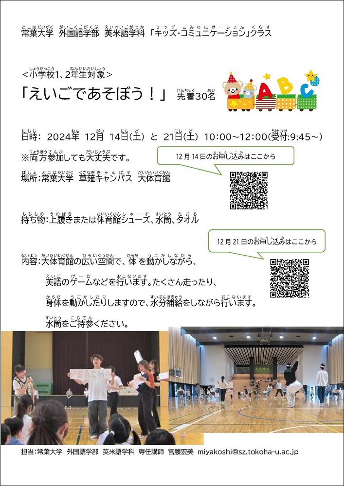 常葉大学の外国語学部・英米語学科で学ぶ2年生から4年生のうち、『キッズ・コミュニケーション』の授業を履修する学生がクサナギ・アリーナ(草薙キャンパス体育館)において、小学校1年生と2年生を対象としたイベント『えいごであそぼう』を開催します。