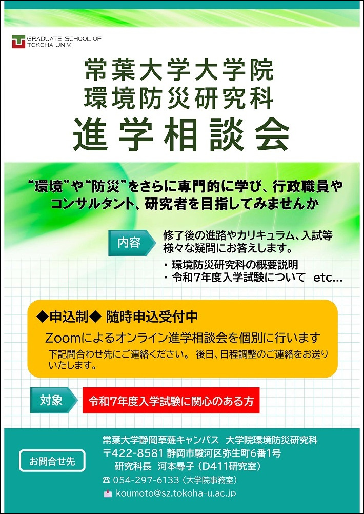 ホーム >  Information >  令和7年度 環境防災研究科 進学相談会(オンライン)のお知らせ/常葉大学大学院