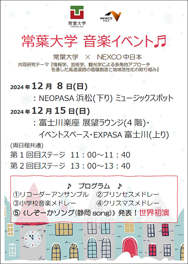 常葉大学とNEXCO中日本の共同研究の成果報告の一環として、教育学部の望月たけ美准教授のゼミ生が作詞・作曲した『しぞーかソング(静岡 song)』を発表するイベントが開催されます。