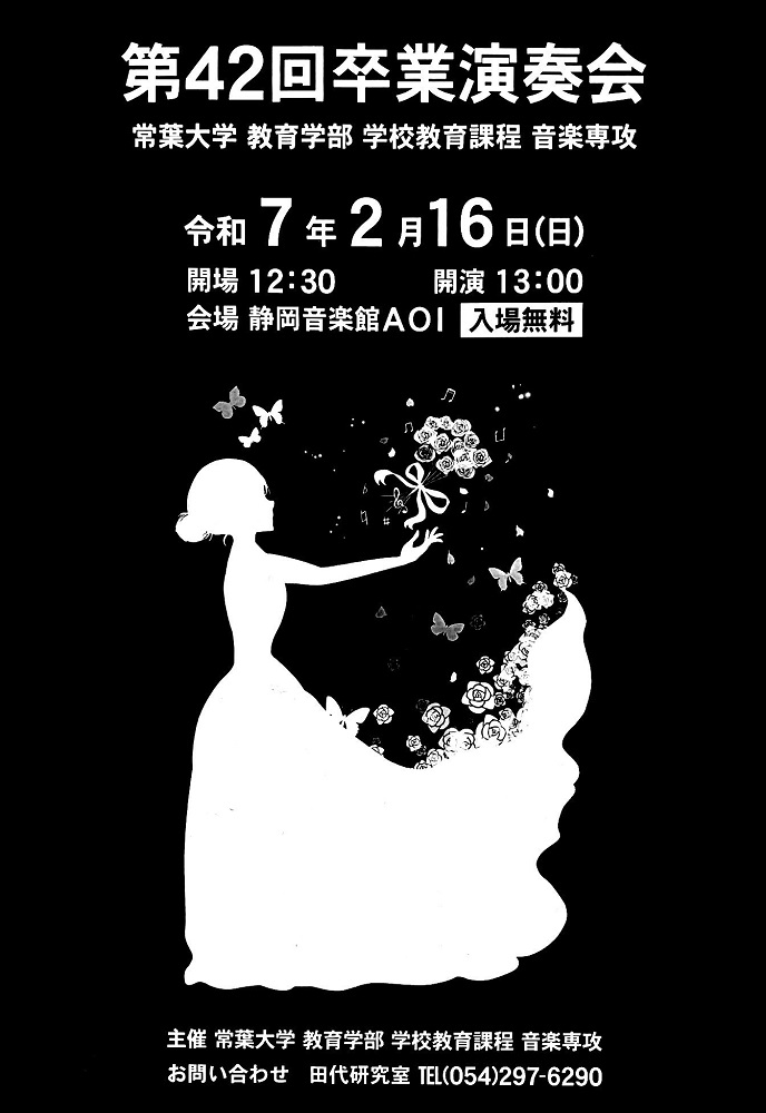 | 教育学部学校教育課程音楽専攻では、静岡音楽館AOIにおいて第42回卒業演奏会を開催いたします。 ピアノと声楽、そして合唱の4年間の成果を発表します。 大勢の皆様のご来場を心よりお待ちしています。 |