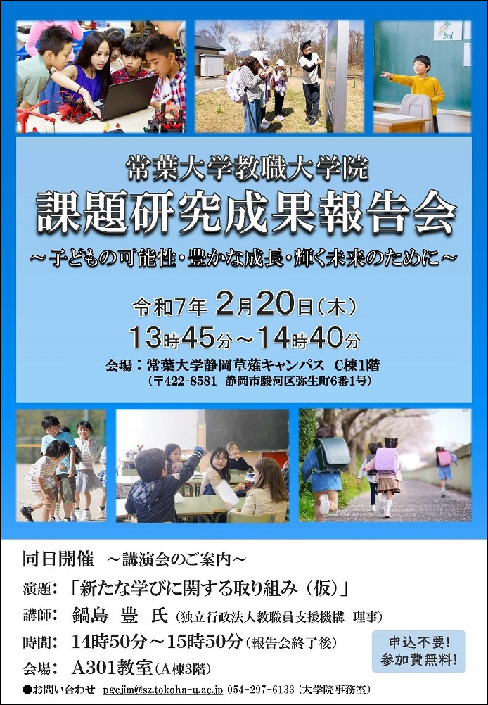 2月20日(木曜日)に、常葉大学教職大学院『令和6年度課題研究成果報告会』が開催されます。