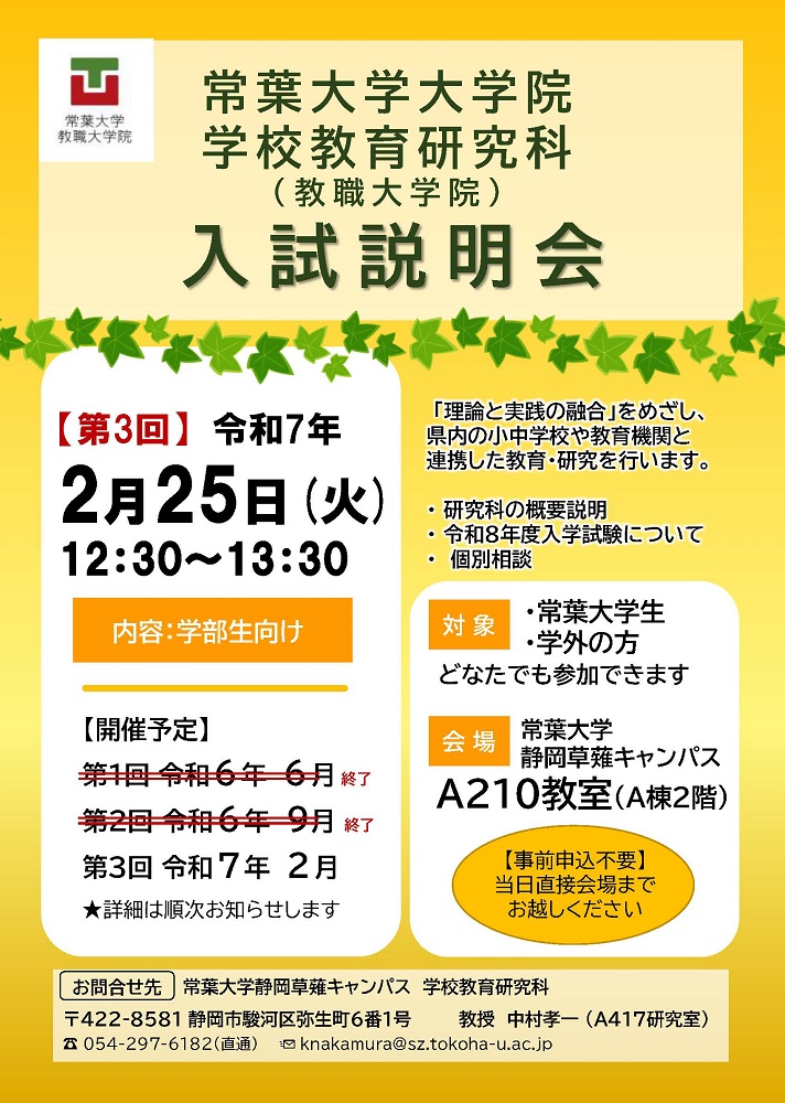 | お問い合わせ | 学校教育研究科 中村孝一 ☎ 054-297-6182(直通) ✉ knakamura(@を挿入)sz.tokoha-u.ac.jp 大学院事務室(静岡草薙キャンパスB棟2階事務局) ☎ 054-297-6133 |