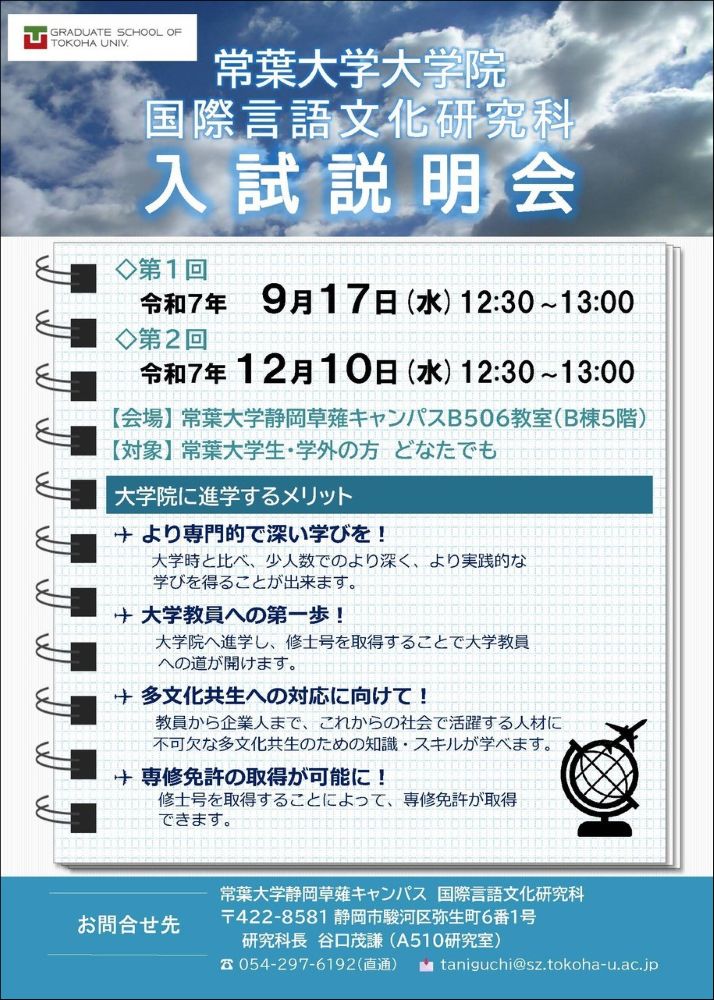 令和8年度 国際言語文化研究科 入試説明会を 常葉大学静岡草薙キャンパスにて開催します。