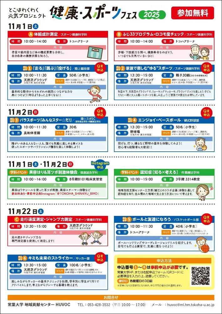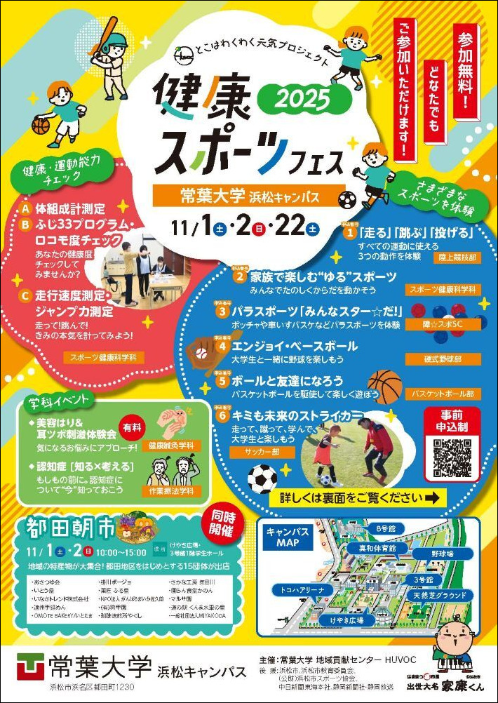 『とこはわくわく元気プロジェクト 健康・スポーツフェス2025』を11月1日(土曜日)・2日(日曜日)・22日(土曜日)に、本学浜松キャンパスで開催します。