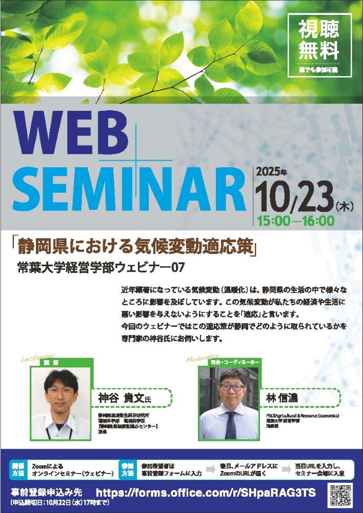 常葉大学経営学部ウェビナー07『静岡県における気候変動適応策』開催のお知らせ(10月23日(木曜日)開催)