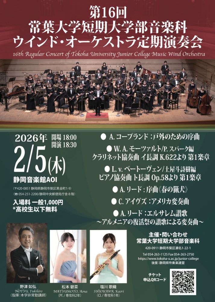 常葉大学短期大学部音楽科では、第16回常葉大学短期大学部音楽科ウインド・オーケストラ定期演奏会を2月5日(木曜日)に静岡音楽館AOIで開催いたします。皆様のご来場を心よりお待ちしています。