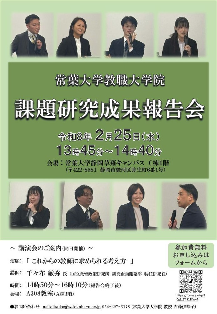 2月25日(水曜日)に、常葉大学教職大学院『令和7年度課題研究成果報告会』が開催されます。
