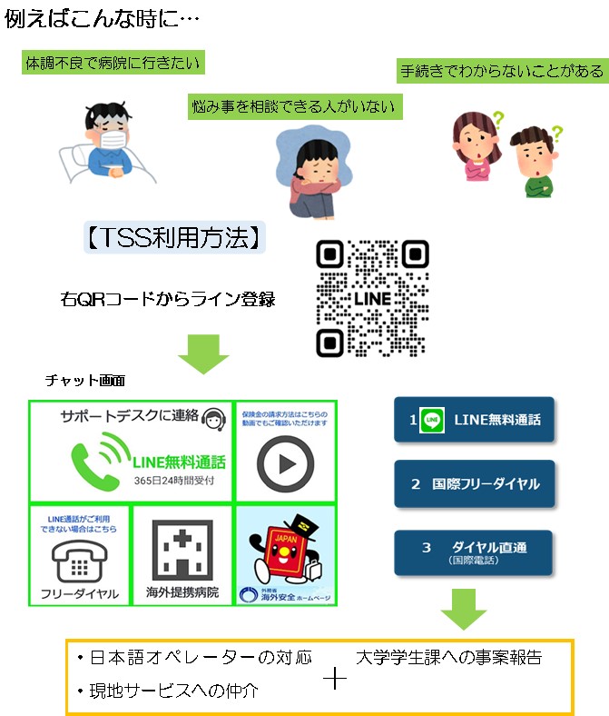 本学で学内留学プログラム参加者に加入を義務付けている『海外留学トータルサポートプログラム(通称TSS)』は24時間365日体制で『国際フリーダイヤル』、『国際優良ダイヤル』、『LINE無料通話』の3つのツールから留学生をサポートする仕組みです。現地医療機関の紹介・予約からトラブルにあったときのアドバイスまで、幅広い内容に対応しています。学生からTSSに入電があった場合、事案対応後に保険会社から大学に情報が共有されます。
