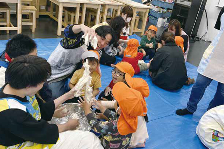 一年を通して複数回開催される子どものあそびば。春には附属幼 稚 園の園児や地域の子どもたちを招き、小麦粘土などの表現遊びを行いました。