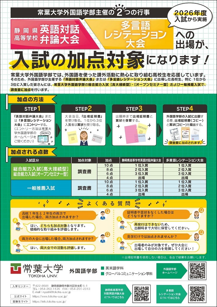 外国語学部が主催する『英語弁論大会』または『多言語レシテーション大会』に出場した高校生、特に1位から3位に入賞した皆さんには、常葉大学外国語学部の総合能力入試[高大接続型]・[オープンセミナー型]および一般推薦入試で、調査書に加点を行います。