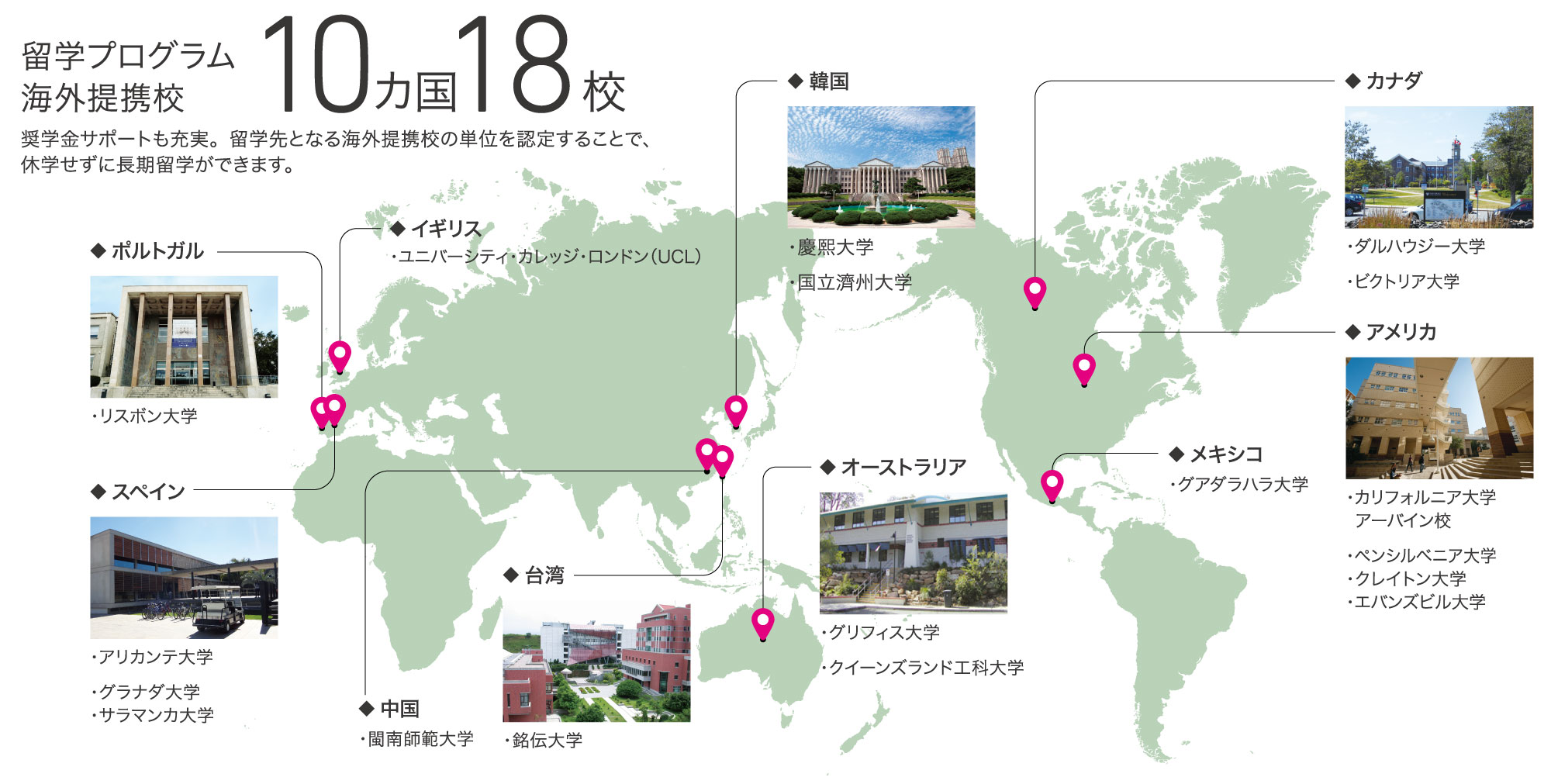 留学の種類も、長期留学、短期留学、語学研修など目標に合わせた多彩なプログラムを用意しています。また、留学生のための学費の一部免除、奨学金制度もあります。