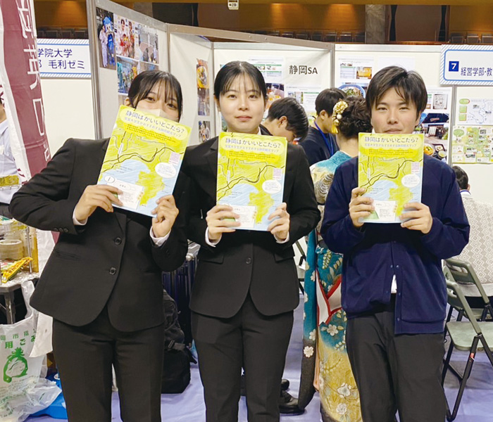 澁谷ゼミでは中日本高速道路株式会社との共同研究において、高速道路利用者に向けた静岡県内の観光マップを制作しました。学生が県内を巡り、厳選した観光スポットやグルメを紹介するとともに、伊豆、県東部・中部・西部の各エリアでのモデルコースを5つ提案しています。