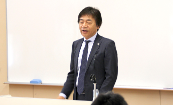 外国語学部グローバルコミュニケーション学科の専攻科目「現代の産業」では、毎年、テーマを設けて、それにふさわしい企業を前期と後期に3社ずつお招きし、特別講義をしていただいています。今年のテーマはスポーツビジネスです。5月19日(木曜日)の授業では、Jリーグの清水エスパルスを運営する株式会社エスパルスより、代表取締役社長の左伴繁雄様にお越しいただきました。
