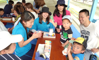 今回は「海」をテーマにさまざまなゲームを企画。学生が海の生き物に変装し、ダンスでこどもたちを出迎えました。魚のすみかに現れた意地悪なイカのため魚たちが逃げてしまい、みんなで探しに行こうというストーリーでスタートしました。各ブースでは魚釣りや宝さがし、紙コップの風鈴づくりが行われ、クリアできたらお魚をもらえるというルールで逃げてしまった魚たちを集めていきました。