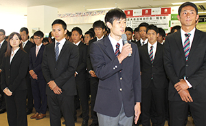 サッカー部の登崎雅貴主将(心身マネジメント学科4年)は「全力で戦い、まずは初戦を突破したい」、陸上競技部の小川拓夢選手(心身マネジメント学科3年)は「最高のパフォーマンスをしたい」、体操の小島美咲さんは「一つでも上位を目指したい」とそれぞれ意気込みを語りました。