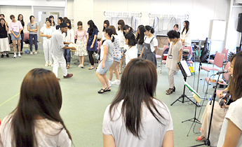 講義の後に、ミカさんの歌とギターの演奏に併せて、全員でボサノバの名曲「イパネマの娘」をポルトガル語で合唱しました。さらに、ホベルトさんからステップを教わりながらサンバを踊り、リズミカルなブラジルの音楽を体感することができました。