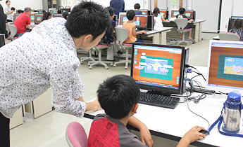 今年度の一番人気は、経営学部の学生か企画した「パソコンをつかって不思議な生物『プログラミン』で遊ぼう」。文科省が運営するWEBサイトを活用してIT教育を推進しようとするもので学生のアドバイスのもと思い思いのキャラクターを作成し楽しんでいました。
