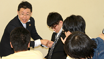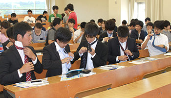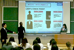 男女別に実施することで、スーツの着こなし以外にも、スーツ・靴の手入れ方法、Yシャツ・ブラウスの形状、ネクタイの締め方など実演を交えた中身の濃い内容で、参加した学生も真剣に聞き入っていました。そして授業後も、自分の着こなしについて個別アドバイスを求める学生もみられました。