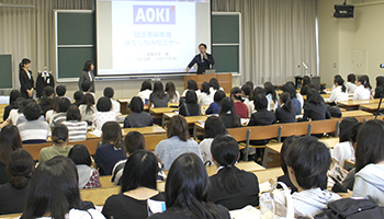 スーツ販売でおなじみの「AOKI」から法人部 田村氏、エリアマネージャー 鳥居氏他3名をお招きして、就活でのリクルートスーツとは、着こなし、注意点についてアドバイスをいただきました。