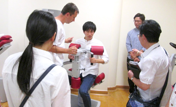 初日は現地の福祉用具販売店を見学し、日本と同じものも多く見られましたが、中には初めて目にする用具が販売されていました。2日目は、医療や心療ケアを行う外来専門のリハビリ施設と優良施設としてドイツ週刊誌に掲載されたことのある総合病院を訪問しました。総合病院では、医師、看護師、理学療法士、作業療法士の方々の案内で施設を見学し、リハビリ室では、説明を受けながら実際にリハビリ器具を体験させていただきました。また、病室を見学した際には、100歳を超えた患者さんから日本に親戚がいると、とてもフレンドリーに声を掛けていただきました。