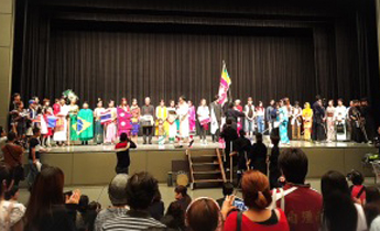 当日は各国の料理の販売、民族衣装の試着体験など多くの催しが行われ、ステージではネパールやタイ、インドネシアの舞踏、ブラジルダンスの披露、中国の楽器二胡(にこ)の演奏、日本の剣道の紹介などが行われました。本学のセビジャーナス部と祭り組も踊りを披露し、会場を盛り上げました。