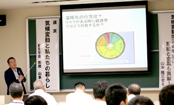山本教授は地球温暖化問題の現状、現在の取り組み状況について講演。国連の気候変動に関する政府間パネル(IPCC)の「第5次影響評価レポート」の作成に、IPCCの指名により山本教授は査読者として参加し、このレポートの概要に基づき、温暖化問題の現状及び将来の見通しが説明され、更に昨年12月に開催された気候変動枠組み条約第21回締約国会議(COP21)で合意されたパリ協定に基づく各国の政策が説明されました。温暖化対策としては、温室効果ガス、二酸化炭素を排出しない再生可能エネルギーの導入が重要である点についても説明が行われました。
