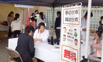 健康相談のコーナーでは日頃の学びを活かし、肩こり、腰痛、胃腸の不調、ストレスなどの悩みにツボ押しをアドバイスし、地域の方とのコミュニケーションを図りました。下山真未さん(健康鍼灸学科3年)は「日頃、勉強していることでもいざというとき、うまく説明ができなかった。もっと勉強しないと」と話していました。