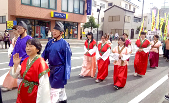 また、今回は次週に行われる万葉まつりのPRを兼ね、学生は奈良時代の万葉衣装を身にまとってパレードにも参加。日本古来の万葉集に浜北のゆかり地が多くうたわれていることもあり浜北地区の文化や歴史にも触れました。今後も学生の実践の場として、地域との交流の場としてイベントに協力していきたいと思います。