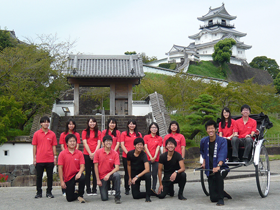 本学経営学部の海野ゼミの学生が掛川市の街なか活性化を目指し、模擬株式会社「人力車常葉組」を設立し、掛川城周辺で人力車事業を行っています。