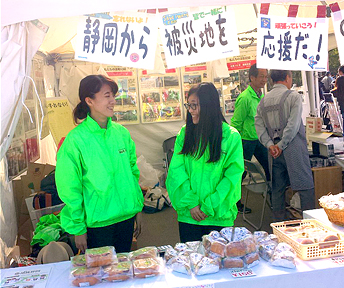 主催者の「SAVE IWATE しずおか」は東日本大震災に関し、(1) 被災地の支援活動事業、(2) 災害関連情報収集及び発信事業、(3) 関係団体とのネットワーク構築事業、(4) 復興まちづくりに関する調査・研究・事業、(5) 活動資金開発にかかる事業を行っている団体です。被災地ではまだ仮設住宅で暮らす方も少なくなく、被災の記憶が風化されないようにと、大道芸ワールドカップイン静岡の会場にて、被災地の物産販売を行いました。
