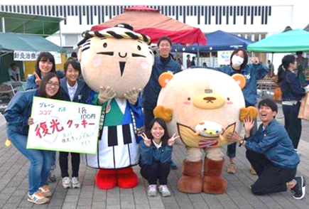 また、地元で人気のゆるキャラも登場し、会場は賑わいを見せていました。このイベントに参加した鈴木美穂さん(健康栄養学科3年)は「クッキーの完売には至りませんでしたが、自分たちの活動と浜松の魅力をたくさんの方に知っていただくいい機会となった」と話してくれました。売上金は「3.11復光キャンドルナイト」の運営費として使用する予定です。今後もThunder Birdsは地域に密着し、さまざまな活動に取り組んでいきます
