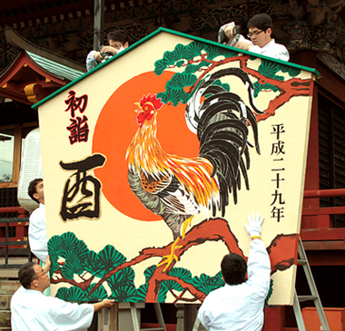 本学造形学部アート表現コースの2年生8人が制作した、来年のえと「酉(とり)」の大絵馬(高さ約3メートル、幅約2.5メートル)が、静岡浅間神社に12月13日(火曜日)に飾られました。造形学部による恒例の制作で、今年で5年目になります。
