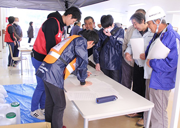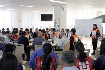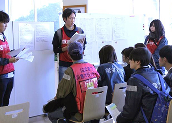 災害ボランティアセンターは、災害が起こった際、被災された方のニーズとボランティアをマッチングさせ、スムーズなボランティア活動を支援するために設置されるものです。当日は、浜松市の都田地区自治会、北区役所、浜松市社会福祉協議会、北区災害ボランティアコーディネーター、他大学の学生、本学の学生・教職員など約130名が参加し、市内で大規模地震が発生した想定で、それぞれがスタッフまたはボランティアに扮して、シミュレーションを行いました。今回は、本学学生が9月に熊本地震の被災地ボランティアで経験したニーズやトラブルなども取り込んだ内容で、より現実的な訓練を実施することができました。