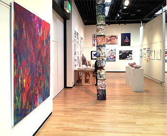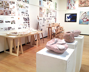 このフェスティバルでは静岡県内の芸術系の学校(大学・高校・専門学校)12校による学生作品(美術・デザイン・書道)が会場内に集結し、県内の芸術系学校の今を一望できる場となっています。造形学部からは、参加校の中では最多となる38点の作品が出品され、広いギャラリーの中でも大変活気のあるブースとなりました。