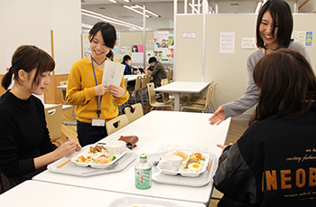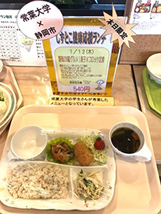 栄養学を学ぶ学生14名が市の管理栄養士のアドバイスを受けながら、日替わりで提供する4つのメニューを考案し、昨年12月には本学静岡キャンパス水落校舎学生食堂でも4日間提供しました。お茶やミカン、海老芋など静岡の特産品を盛り込み、サラダやスープなどで野菜を多く摂取できるように工夫しました。ランチは1日50食の限定でしたが、どの回も大盛況で、いずれも早々に完売しました。